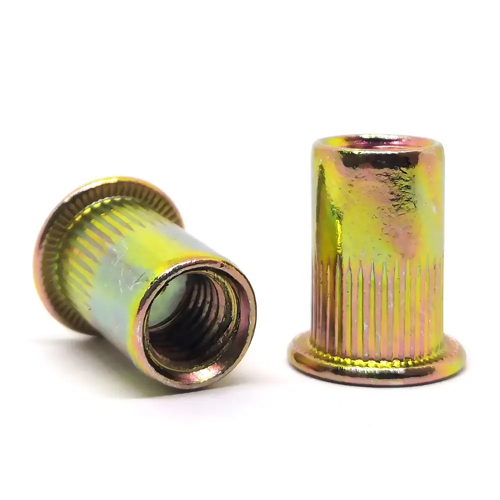 DIN7340 Knurled Rivet Nuts with galvanized zinc plating excel in applications requiring secure threading in thin or inaccessible materials across industries. In automotive manufacturing, they mount license plates, interior panels, and lightweight frames, where the knurling ensures vibration-resistant holds during vehicle operation. Furniture assembly benefits from their use in metal frames and cabinets, providing strong joints without damaging delicate surfaces. Construction sectors apply them for light-duty structural connections, such as attaching fixtures to sheet metal or hollow sections in buildings. Electronics and appliance production utilize these nuts for embedding threads in enclosures, leveraging the zinc plating for corrosion protection in humid environments. In general industry, they support pipeline fittings and equipment housings, enabling quick blind installations. Duojia’s products, exported to regions like Russia and Australia, accommodate custom needs in marine accessories for rust-free performance. With simple tool-based riveting and easy coating repairs, they minimize downtime, enhancing efficiency in both heavy and light applications, from DIY projects to professional builds, ensuring reliable, long-lasting threaded solutions.