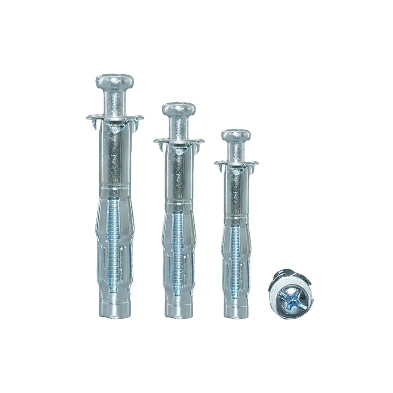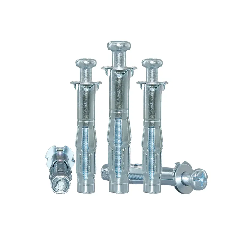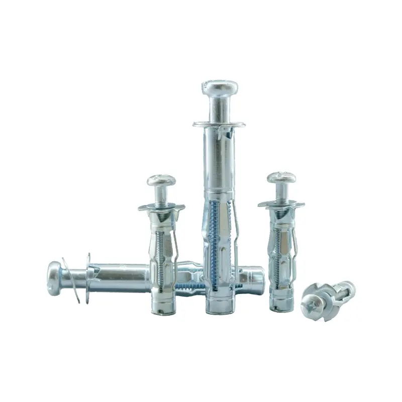 - Механизм работы: Анкер состоит из цилиндрической гильзы с прорезями, интегрированным фланцем и предустановленным крестовым полукруглым болтом. На нижней стороне фланца имеются мелкие зубцы, предназначенные для врезания в поверхность стены, что предотвращает проворачивание анкера во время установки. При затягивании болта резьбовая часть гильзы подтягивается вперед, в результате чего тело гильзы с прорезями сжимается и расширяется, образуя набор “лапок”, которые плотно прижимаются к обратной стороне полой стены.